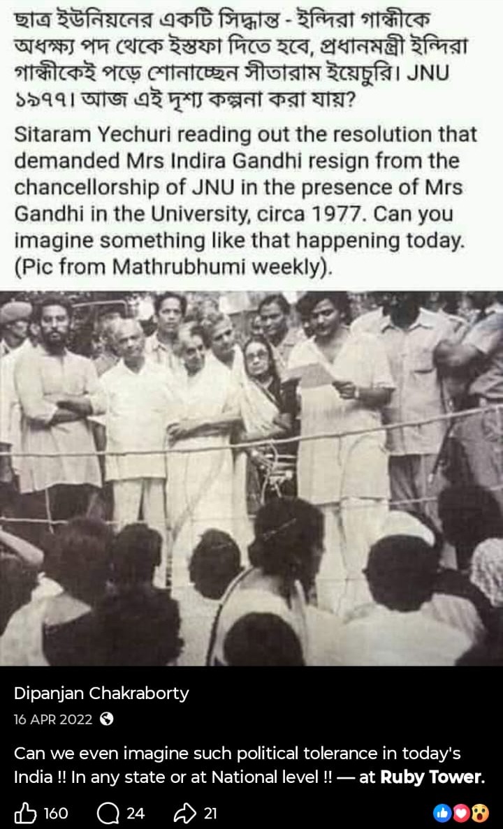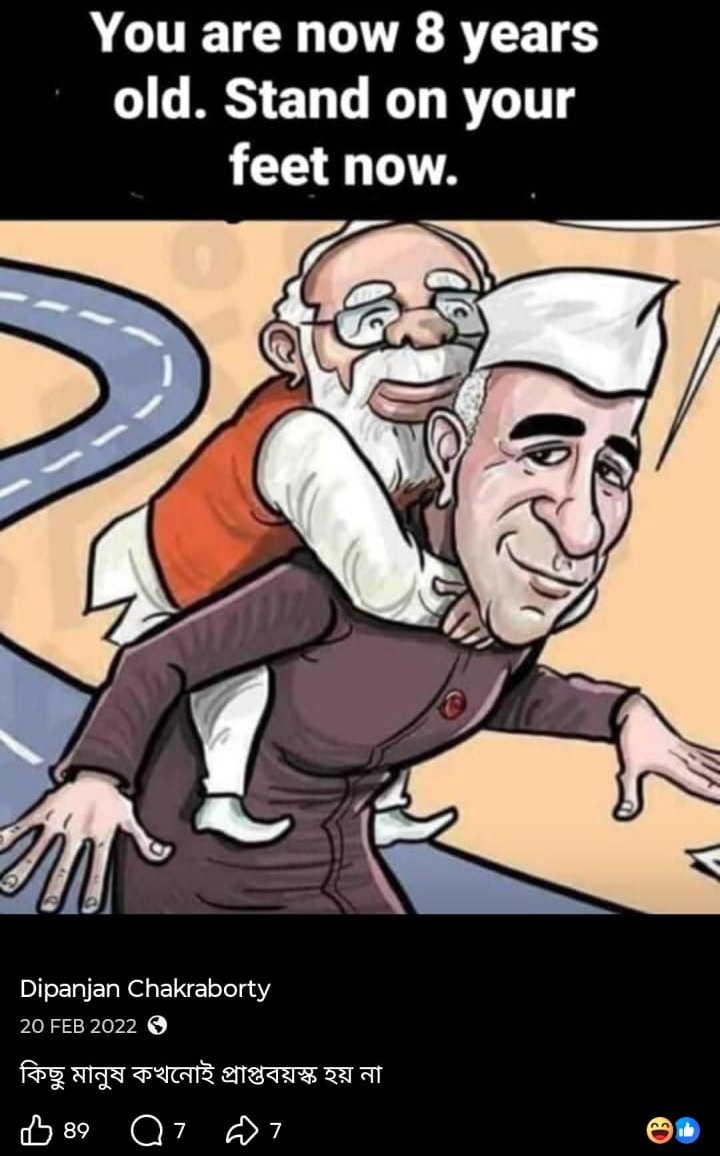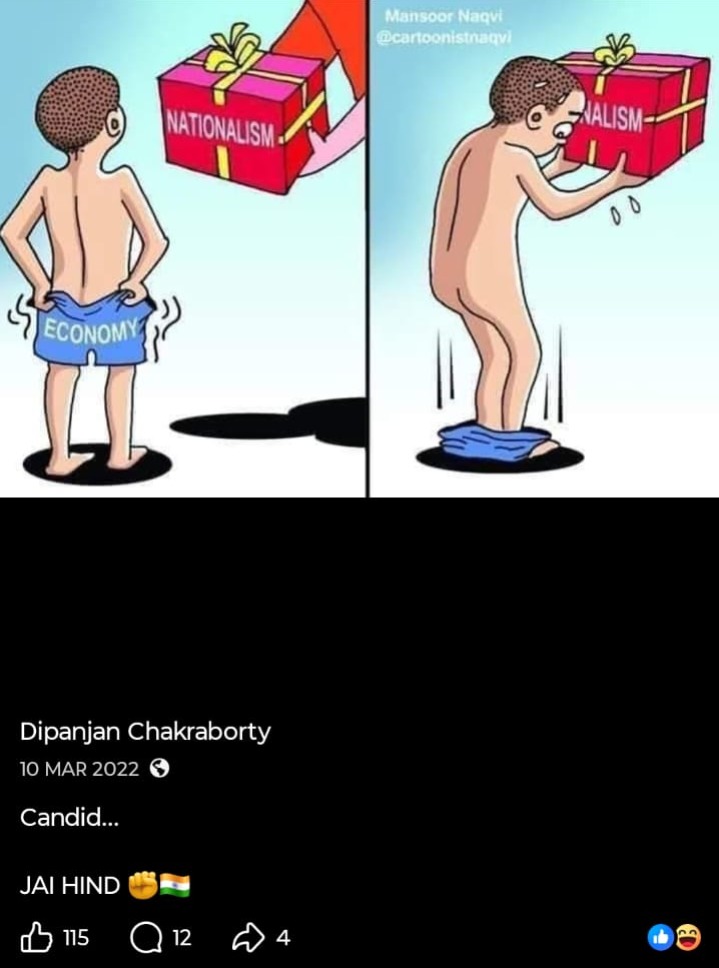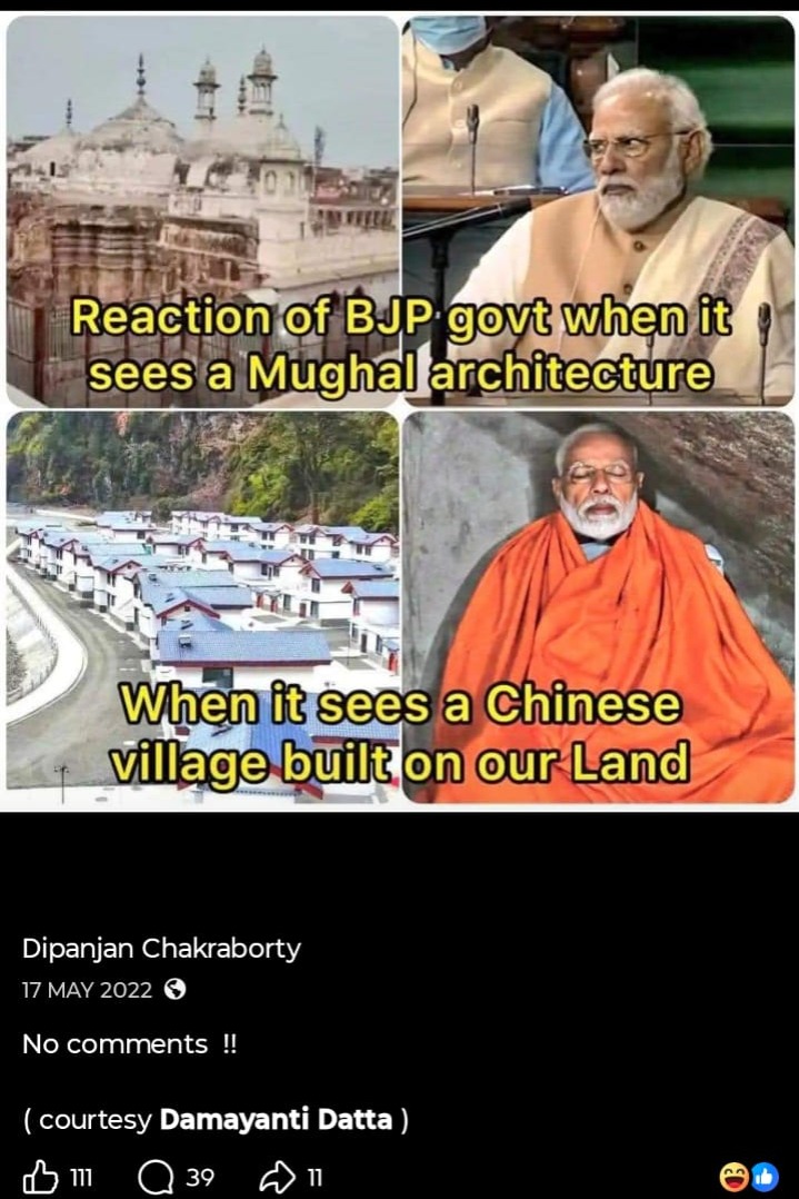 মোদি সরকারকে আক্রমণ করে সোশাল মিডিয়ায় (Social Media) একের পর এক পোস্ট, এমনকী অশালীন পোস্টও করেন প্রাক্তন এনএসজি কমান্ডো। নিজেকে চরম বামপন্থী প্রমাণে চে গেভারার ছবির সঙ্গে ছবি তুলে একই টুপি পরে প্রোফাইল ছবি করেছেন। সরাসরি মোদিকে ‘প্রতারক’ বলেও আক্রমণ করেছেন। ১৯৭৭ সালে জওহরলাল নেহরু বিশ্ববিদ্যালয়ে ইন্দিরা গান্ধির ইস্তফার দাবি উঠেছিল। বিশ্ববিদ্যালয়ে দাঁড়িয়েই সেই দাবি ইন্দিরাকে পড়ে শোনাচ্ছিলেন সীতারাম ইয়েচুরি। এই ছবি পোস্ট করে দীপাঞ্জন প্রশ্ন তুলেছিলেন, “আজকের ভারতে কি এই দৃশ্য কল্পনা করা যায়?“ আর একটি পোস্টে দেখা যাচ্ছে, একটি ছবি পোস্ট করে এক ব্যক্তি ‘জয় শ্রী রাম’ বলে চিৎকার করছেন আবার তার উলটো দিকে থাকা এক ব্যক্তি শান্ত হয়ে বলছেন ‘জয় বাবা ফেলুনাথ’। ক্যাপশনে তিনি লিখেছেন, “এর থেকে বেশি কিছু বলার নেই, অবশ্য বেশি কিছু বলার ছিলও না।“