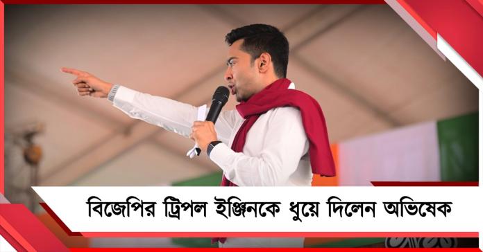 বিজেপির ডবল ইঞ্জিন-কে কটাক্ষ করে অভিষেক বলেন, “পুরুলিয়ায় ওদের ট্রিপল ইঞ্জিন সরকার। উপরে মোদি সরকার, মাঝে সাংসদ জ্যোতির্ময় সিং মাহাতো আর নীচে বিজেপির বিধায়করা। কিন্তু কাজের বেলা শূন্য। গত ৭ বছরে জ্যোতির্ময় সিং মাহাতো হয় দিল্লিতে নয়তো রাঁচিতে থেকেছেন। মানুষের জন্য ৭ মিনিটও সময় দেননি।” আরও বলেন, “কেউ যদি দেখাতে পারে গত ৭ বছরে জ্যোতির্ময় সিং মাহাতোর নেতৃত্বে পুরুলিয়ার একটা পঞ্চায়েত বা শহরে উন্নয়ন হয়েছে বা ১০ জন মানুষকে কেন্দ্রীয় পরিষেবা পৌঁছে দেওয়া হয়েছে, তবে আমি আর তৃণমূলের হয়ে ভোট চাইতে আসব না।”