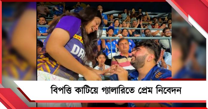 গ্যালারিতে হাঁটু গেড়ে বসে আংটি হাতে প্রস্তাব দিচ্ছিলেন ওই মুম্বই সমর্থক। উল্টোদিকে ছিল কেকেআর জার্সি পরা তরুণী। কিন্তু ঠিক সেই সময়ই হাত ফসকে পড়ে যায় আংটি। আশেপাশের দর্শকরাও খুঁজতে নেমে পড়েন। কয়েক সেকেন্ডের জন্য ম্যাচের উত্তেজনা ছাপিয়ে যায় আংটি খোঁজার ব্যস্ততা।