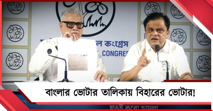 বুধবার সাংবাদিক বৈঠক থেকে একাধিক বিহারের ভোটারের তথ্য তুলে ধরেন সাংসদ ডেরেক ও’ব্রায়েন ও মন্ত্রী ব্রাত্য বসু। ব্রাত্য দাবি করেন, যে ভুলগুলি নির্বাচন কমিশনের ধরার কথা সেগুলি তৃণমূলকে ধরতে হচ্ছে। তারা টুইট করতে ব্যস্ত। মমতা বন্দ্যোপাধ্যায়, অভিষেক বন্দ্যোপাধ্যায় সতর্ক করতে করতে গিয়েছেন। তারপরেও গাদা গাদা ভুয়ো ভোটার ঢুকিয়ে বাংলাকে দখল করার চেষ্টা করছে। একই মডেল সব সংসদীয় সংস্থাকে ধ্বংস করছে।