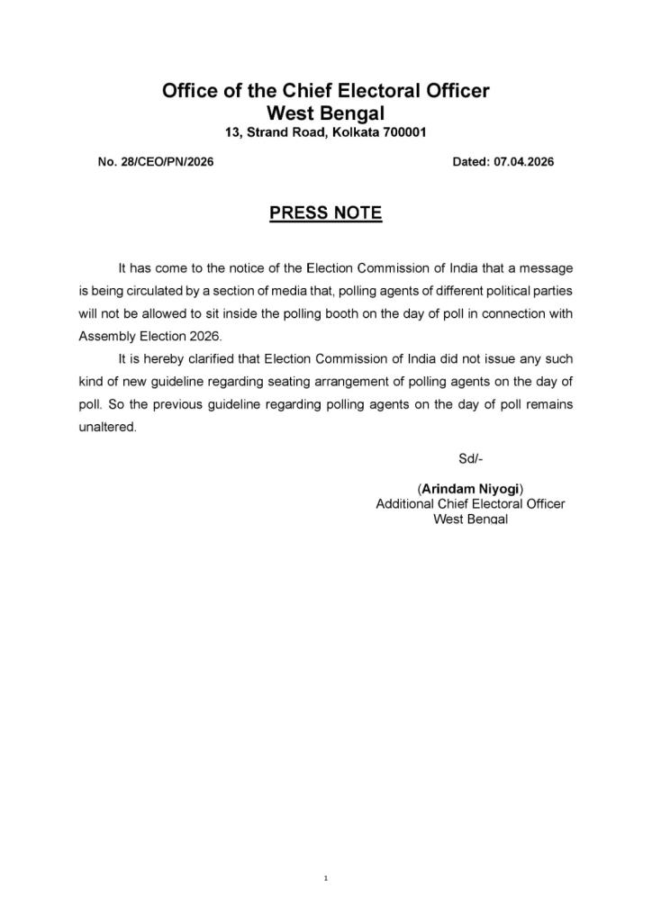 রাজ্যের মুখ্য নির্বাচনী আধিকারিকের দফতর থেকে মঙ্গলবার জারি করা একটি বিজ্ঞপ্তিতে জানানো হয়েছে, এ ধরনের কোনও নতুন নির্দেশিকা জারি করেনি নির্বাচন কমিশন। ফলে পোলিং এজেন্টদের বসার ক্ষেত্রে আগের নিয়মই বহাল থাকবে। কমিশনের দাবি, একাংশের মাধ্যমে এই ভুয়ো বার্তা ছড়ানো হচ্ছিল। সেই কারণেই বিষয়টি পরিষ্কার করে জানানো হল।