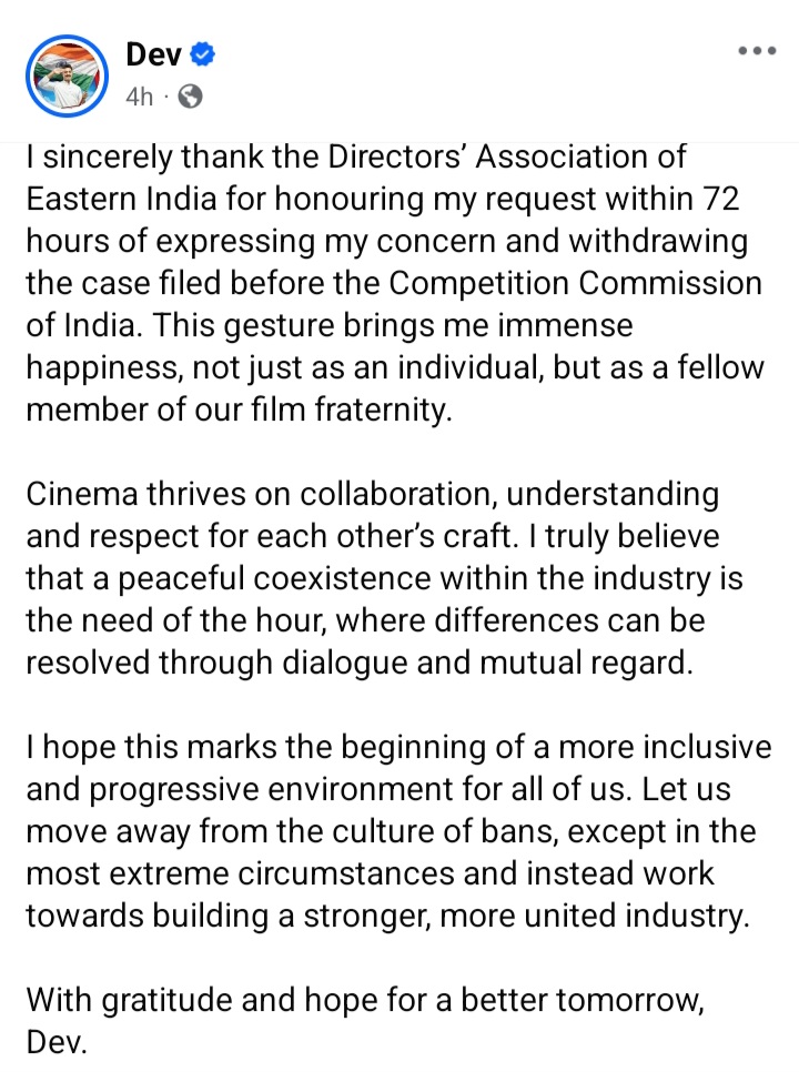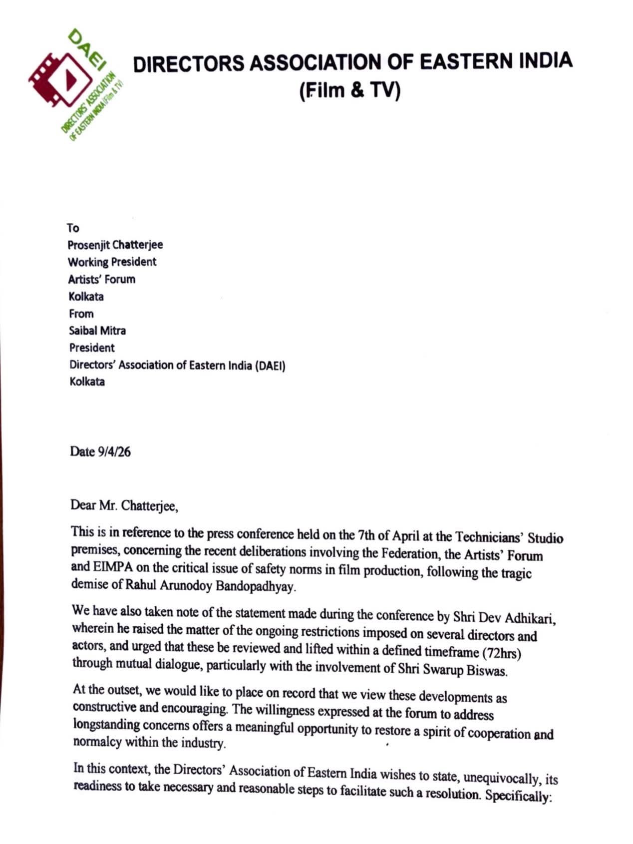 নিষেধাজ্ঞা থেকে সহাবস্থান, সত্যিই কি টলিপাড়ায় অতীত হতে চলেছে বয়কট সংস্কৃতি (Ban Culture)? সিনেমা – সিরিজের কাজে ফিরতে চলেছেন অভিনেতা অনির্বাণ ভট্টাচার্য (Anirban Bhattacharya)? বৃহস্পতিবার সন্ধ্যায় কিছুটা হলেও আশার আলো টালিগঞ্জের স্টুডিও পাড়ায়। ৭২ ঘণ্টার ডেডলাইন বেঁধে দিয়ে টলিউডের ‘ব্যান কালচার’ তুলে দেওয়ার ব্যাপারে প্রসেনজিৎ চট্টোপাধ্যায়কে (Prosenjit Chatterjee) সময় দিয়েছিলেন অভিনেতা দেব (Dev)। ৪৮ ঘণ্টা কাটতে না কাটতেই সমাজমাধ্যমে পোস্ট করে ডিরেক্টরস গিল্ডের বড় পদক্ষেপের কথা জানালেন সুপারস্টার। প্রসেনজিতকে চিঠি পাঠিয়ে ফেডারেশনের (FCTWEI) বিরুদ্ধে মামলা প্রত্যাহারের কথা জানিয়েছে ‘ডিরেক্টরর্স অ্যাসোসিয়েশন অফ ইস্টার্ন ইন্ডিয়া’। তাহলে কি সত্যিই কাজে ফিরতে পারবেন অনির্বাণ-সহ নিষিদ্ধ হওয়া শিল্পীরা। এখনই এই নিয়ে চূড়ান্ত সিদ্ধান্ত নিতে নারাজ FCTWEI সভাপতি স্বরূপ বিশ্বাস (Swarup Biswas)।