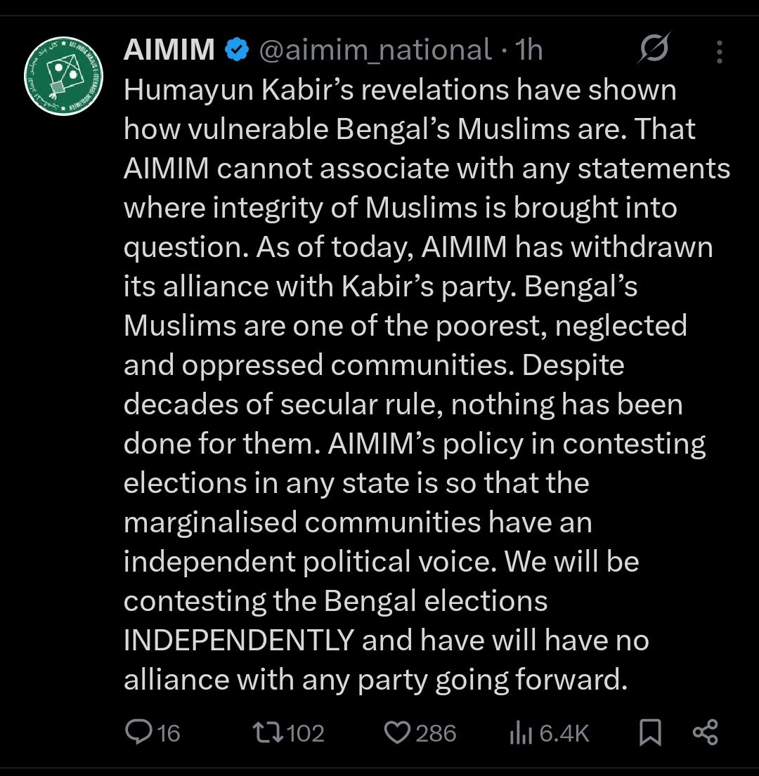 বাবরি মসজিদের নামে বাংলার সংখ্যালঘু ভোটারদের আবেগ নিয়ে ছেলেখেলা, ভোট ভাগ করতে বিজেপির সঙ্গে হাজার কোটি টাকার গোপন আঁতাত প্রকাশে আসতেই এবার হুমায়ুন কবীরের হাত ছাড়লেন আসাদউদ্দিন ওয়েইসি(Asaduddin Owaisi left Humayun Kabir’s hand)। অর্থাৎ আমজনতা উন্নয়ন পার্টির সঙ্গে জোটে নেই মিম(AIMIM)। শুক্রবার সকালে এক্স হ্যান্ডেলে পোস্ট করে জানানো হয়েছে এবারের নির্বাচনে তারা বাংলায় একলা এবং স্বাধীনভাবে লড়বে।