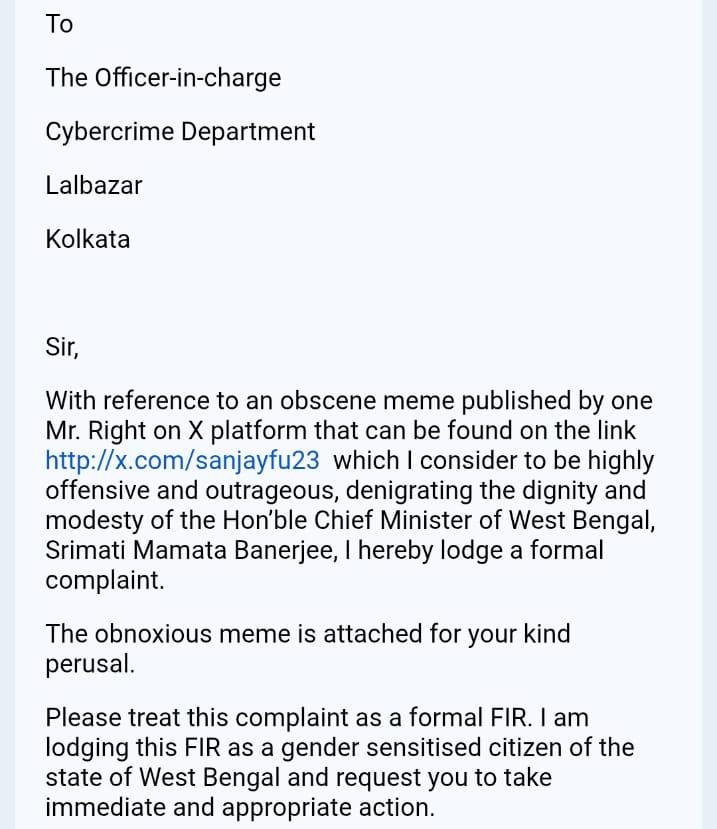 তনভির ও অনন্যা তাঁদের অভিযোগ পত্রে লেখেন, যে জঘন্য মিম সোশ্যাল মিডিয়ায় ভাইরাল হয়েছে, তা শুধু মহিলাদের জন্য অবমাননাকর নয়, বাংলার সাম্প্রদায়িক সম্প্রীতি নষ্টের উস্কানিও। ‘মিস্টার রাইট’ নামে যিনি স্যোশাল মিডিয়ায় এই জঘন্য নারীবিদ্বেষী পোস্টটি (Meem) করেছেন, তিনি শুধু বাংলার মুখ্যমন্ত্রীকে অপমান করেননি, বাংলার ভোটের আগে সাম্প্রদায়িক মেরুকরণকে তীব্রতর করার ছক কষেছেন বলে অভিযোগ তনভিরদের। এই ঘৃণ্য চেষ্টার বিরুদ্ধে আইননানুগ ব্যবস্থার দাবি জানান তাঁরা।